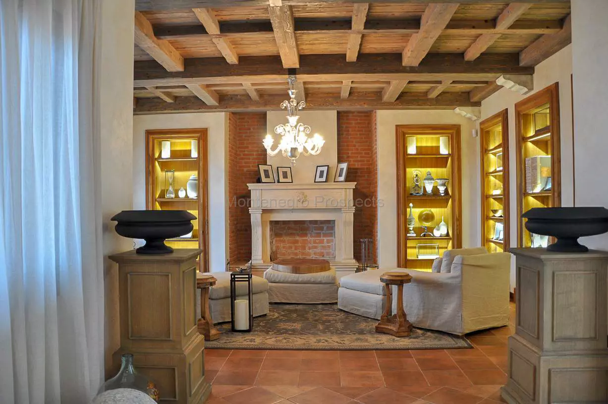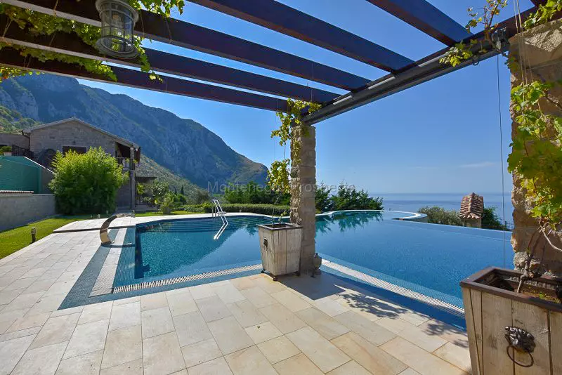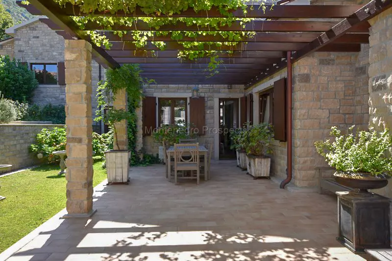Fasade su obložene crnogorskim klesanim kamenom. Krov je prekriven tradicionalnim italijanskim crepovima a ograde od sibirske breze i nerđajućeg čelika.