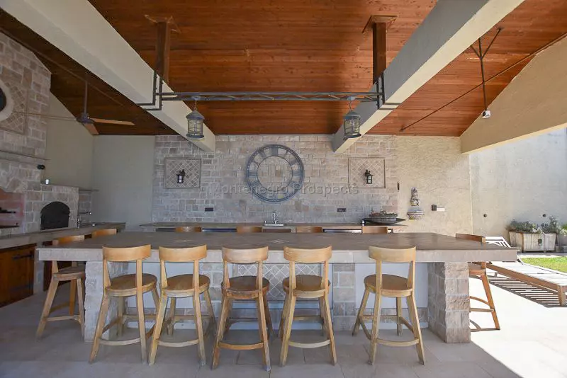 “infinity” bazen sa ljetnjom kuhinjom I masivniim stolom za objedovanje roštiljem, furunom I kuhinjskom opremom na kojoj bi pozavidela većina savremenih restorana u Crnoj Gori, te luksuznim plažnim mobilijarom koji možete premjestati sa velikih travnatih površina u hlad velike nadstrešice, pružiće nesvakidašnji užitak vašim gostima I vašoj porodici.
